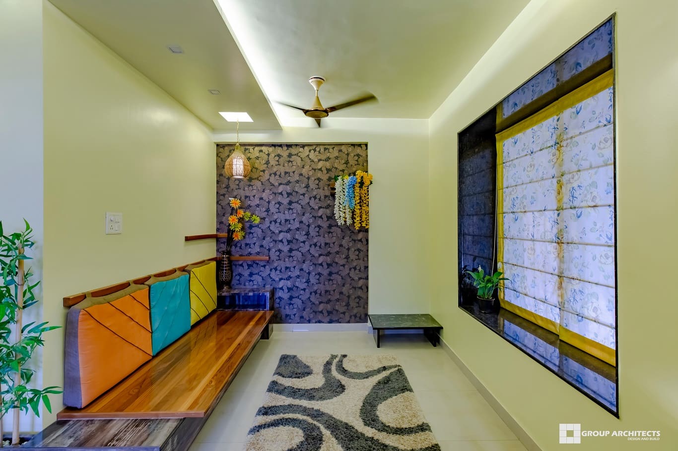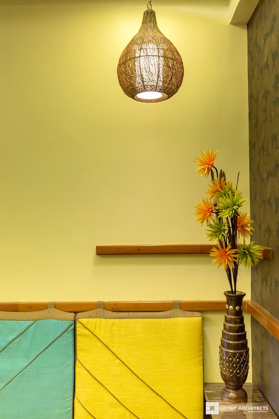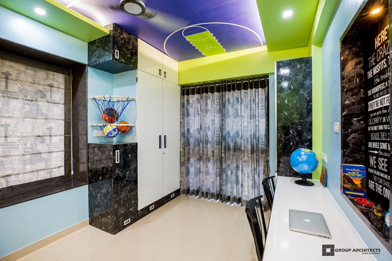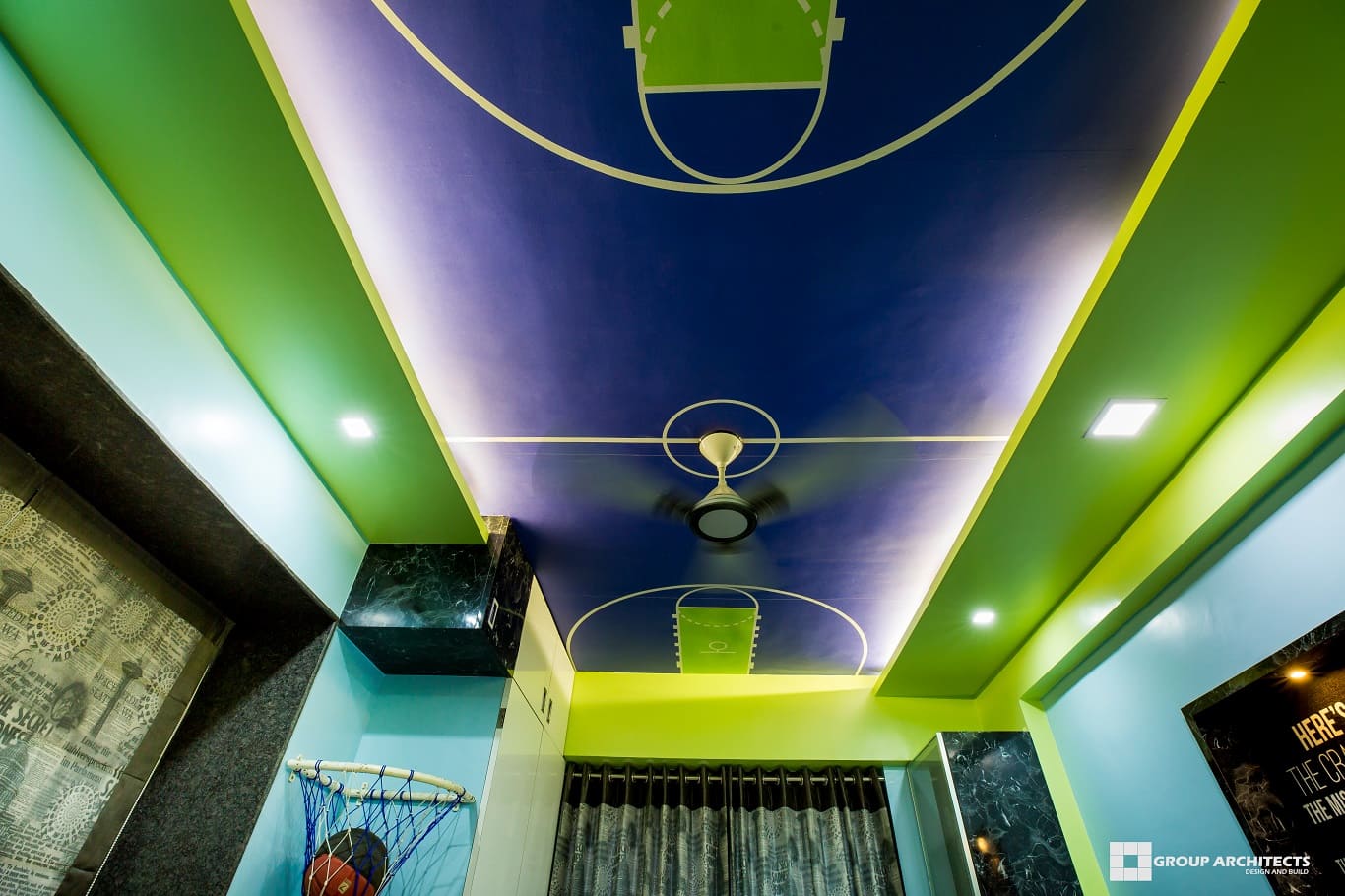 Ethnic style Interior look was the basic concept behind this project. Use of cornices, bells, rustic colours & Krishna painting for master bedroom with deck bed layout was done to acheive the same. Keeping the boy's choices in mind, the other bedroom is designed considering basket ball court, cycling theme with life thoughts. What's more all this done meeting the parameters of a vastu complaint design. The living room designer Maple Leaf Artwork Lighting is the highlight of project.