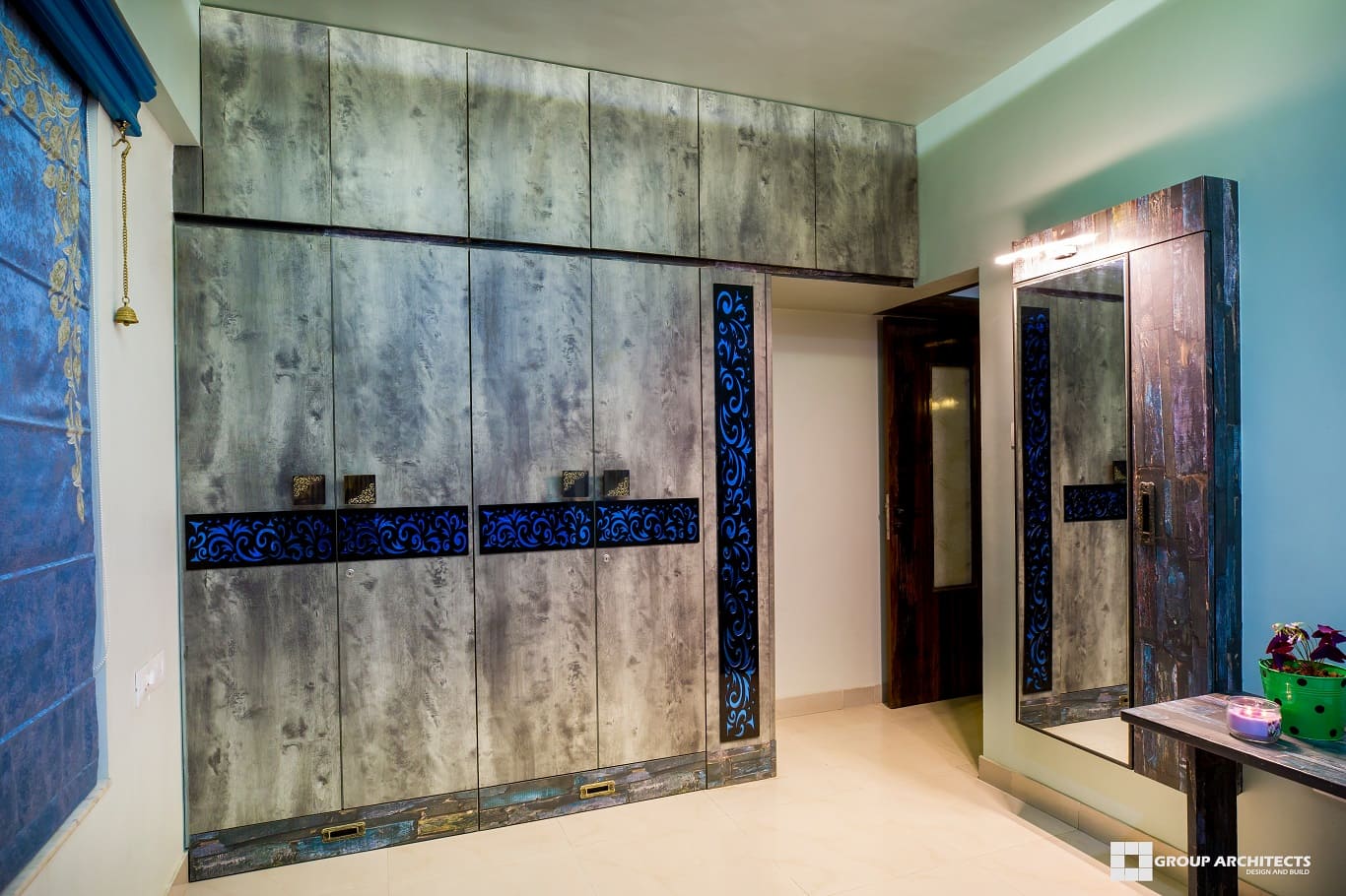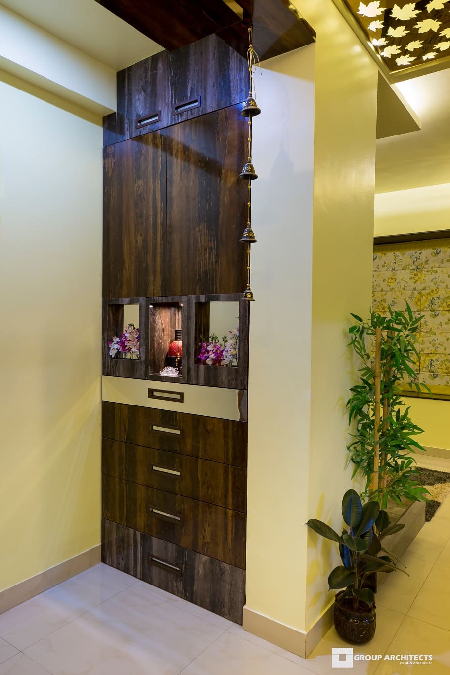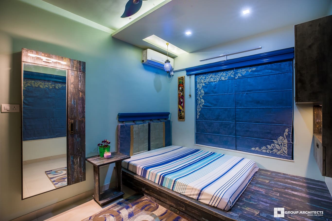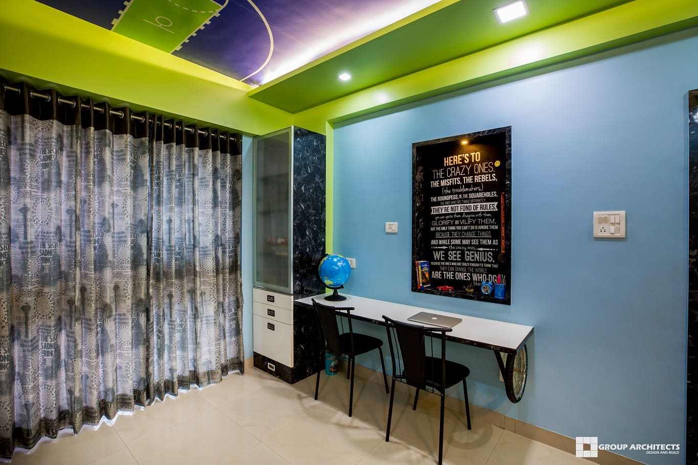Ethnic style Interior look was the basic concept behind this project. Use of cornices, bells, rustic colours & Krishna painting for master bedroom with deck bed layout was done to acheive the same. Keeping the boy's choices in mind, the other bedroom is designed considering basket ball court, cycling theme with life thoughts. What's more all this done meeting the parameters of a vastu complaint design. The living room designer Maple Leaf Artwork Lighting is the highlight of project.